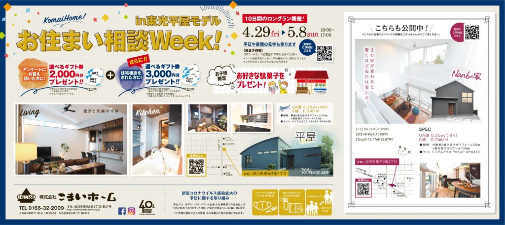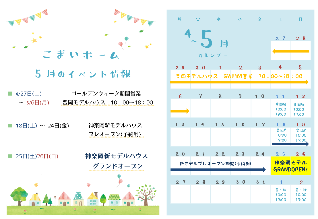 4/28㈫から5/6㈬までのGW期間中、豊岡モデルハウス・神楽岡モデルハウスは10:00~17:00の公開を致します。