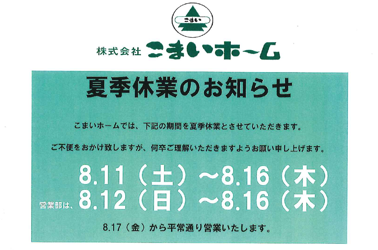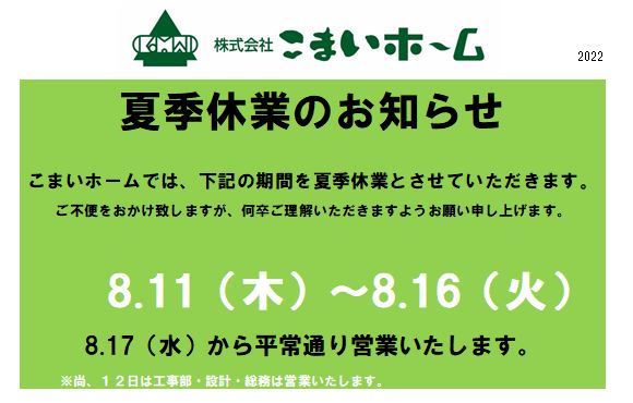 ・夏季休業のお知らせです。