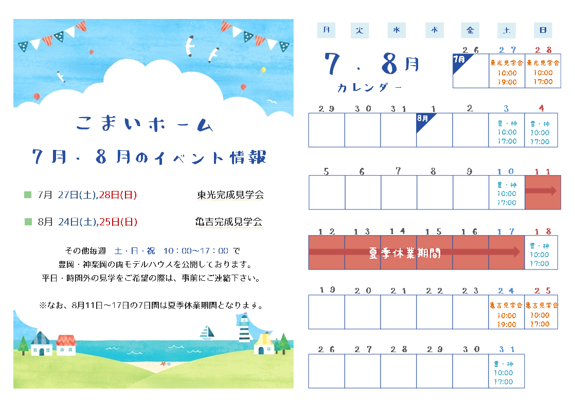 7/25㈯26㈰は豊岡モデルハウス・神楽岡モデルハウスの公開をお休みさせて頂きます。イベントは実施中です!