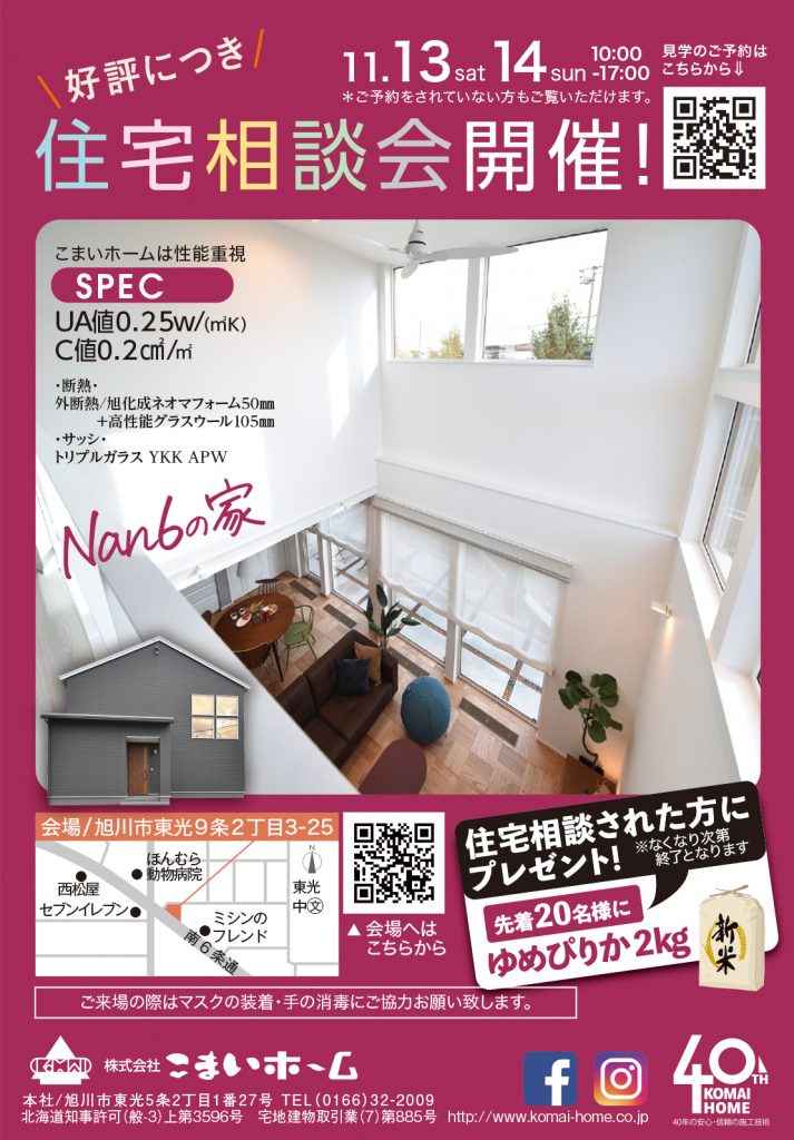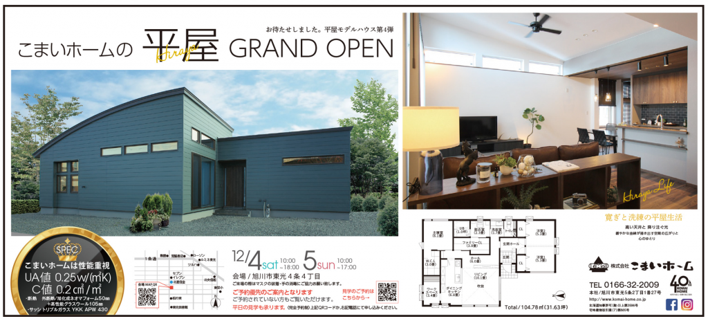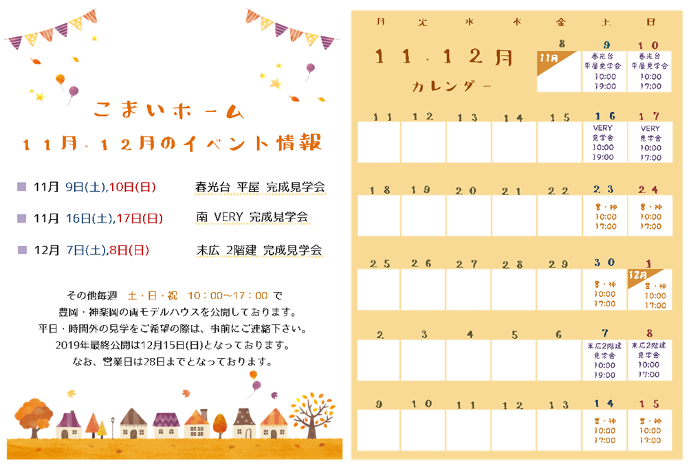 11/23㈯は神楽岡モデルハウスのみ10:00~17:00の公開、24㈰は豊岡モデルハウス・神楽岡モデルハウスとも10:00~17:00の公開とさせて頂きます。